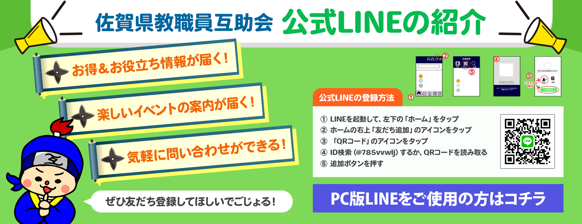 お知らせ 2026年03月13日互助会報互助会報 号外 令和08年03月New!!2026年02月05日互助会報互助会報(第297号)令和08年02月2026年01月07日互助会報互助会報(第296号)令和08年01月2025年12月08日互助会報互助会報(第295号)令和07年12月2025年11月11日互助会報互助会報(第294号)令和07年11月2025年10月30日お知らせ公益文化事業スクールコンサート業務委託契約募集に係る質問への回答を掲載します。 お知らせ一覧 互助会報バックナンバー 互助会について 互助会とは、「皆でお金を出し合い、困ったときや支援が必要なときに助け合う」ための組織です。佐賀県教職員互助会は、佐賀県在住の教職員の皆様の暮らしを守るために結成されました。加入すると、さまざまな割引や厚生サービスを受けることができ、病気・災害・死亡などの有事の際には、給付を受けることができます。また、資金が必要になったときには低金利で借りることが可能です。 教職員互助会とは 情報公開 申請様式一覧 Q & A 事業内容 給付事業 さまざまなシーンに応じて互助会員の皆様に給付を行います。 詳しく見る 貸付事業 互助会員が臨時に資金を必要とするとき、貸付けを受けることができます。 詳しく見る 厚生事業 人間ドックの補助や会員割引。退職後の生活に役立つ講演会の紹介など。 詳しく見る 子育て支援事業 会員の皆様の子育てを応援します。支援や割引のサービスをご利用いただけます。 詳しく見る 保険事業 加入教職員の皆様におすすめの保険を掲載しています。 詳しく見る イベント事業 教職員向けの講演会・セミナーや各種イベントを行っています。 詳しく見る 公益文化事業 佐賀県の教育と文化の向上のために活動しています。 詳しく見る